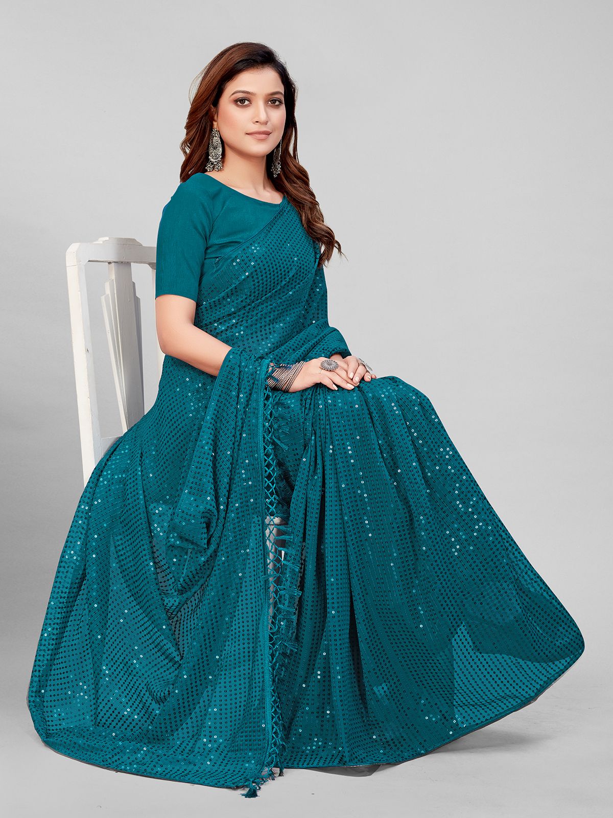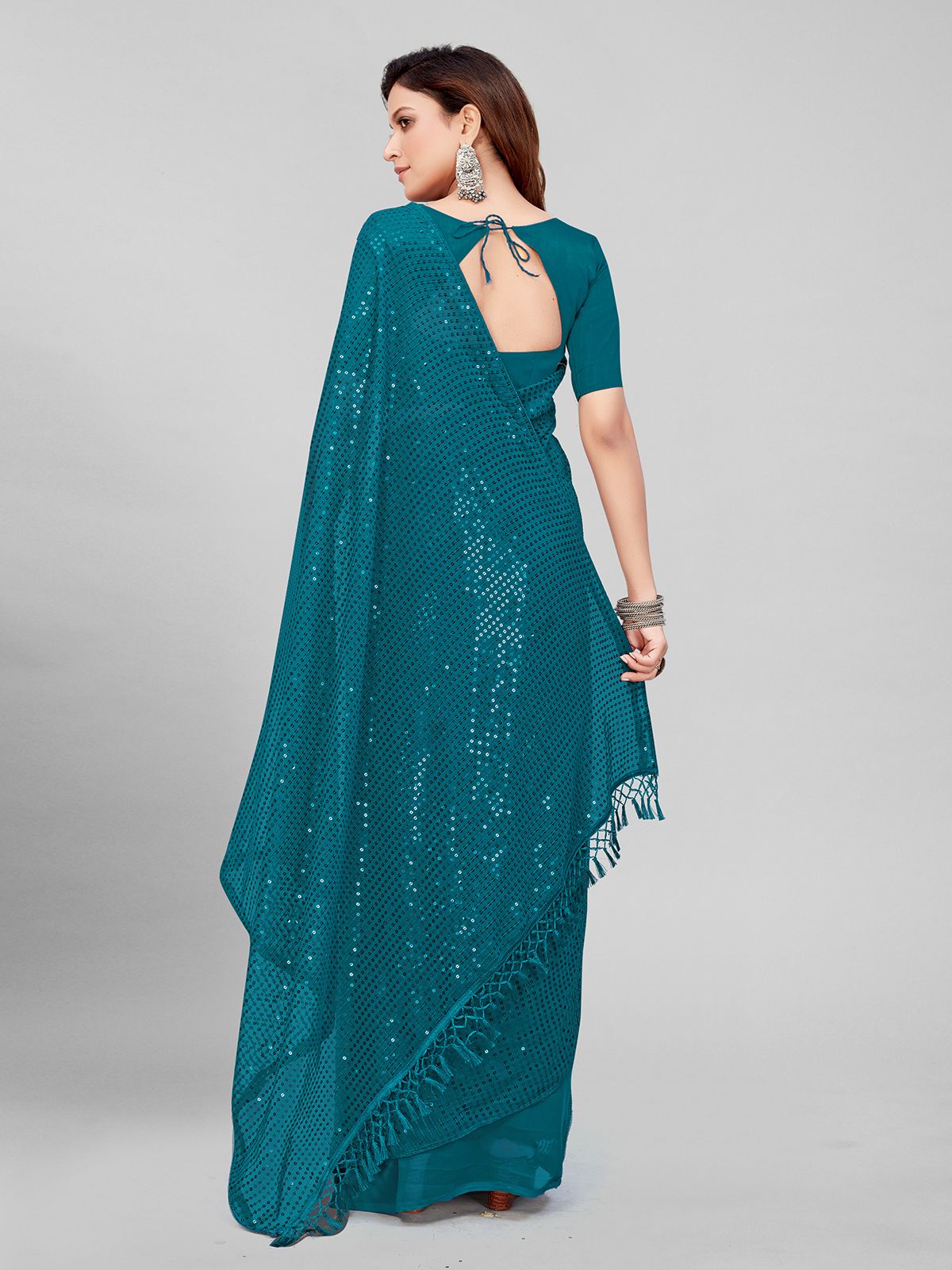 Fancy Sequined Embroidered Teal Blue Coloured Georgette Saree with Blouse Piece