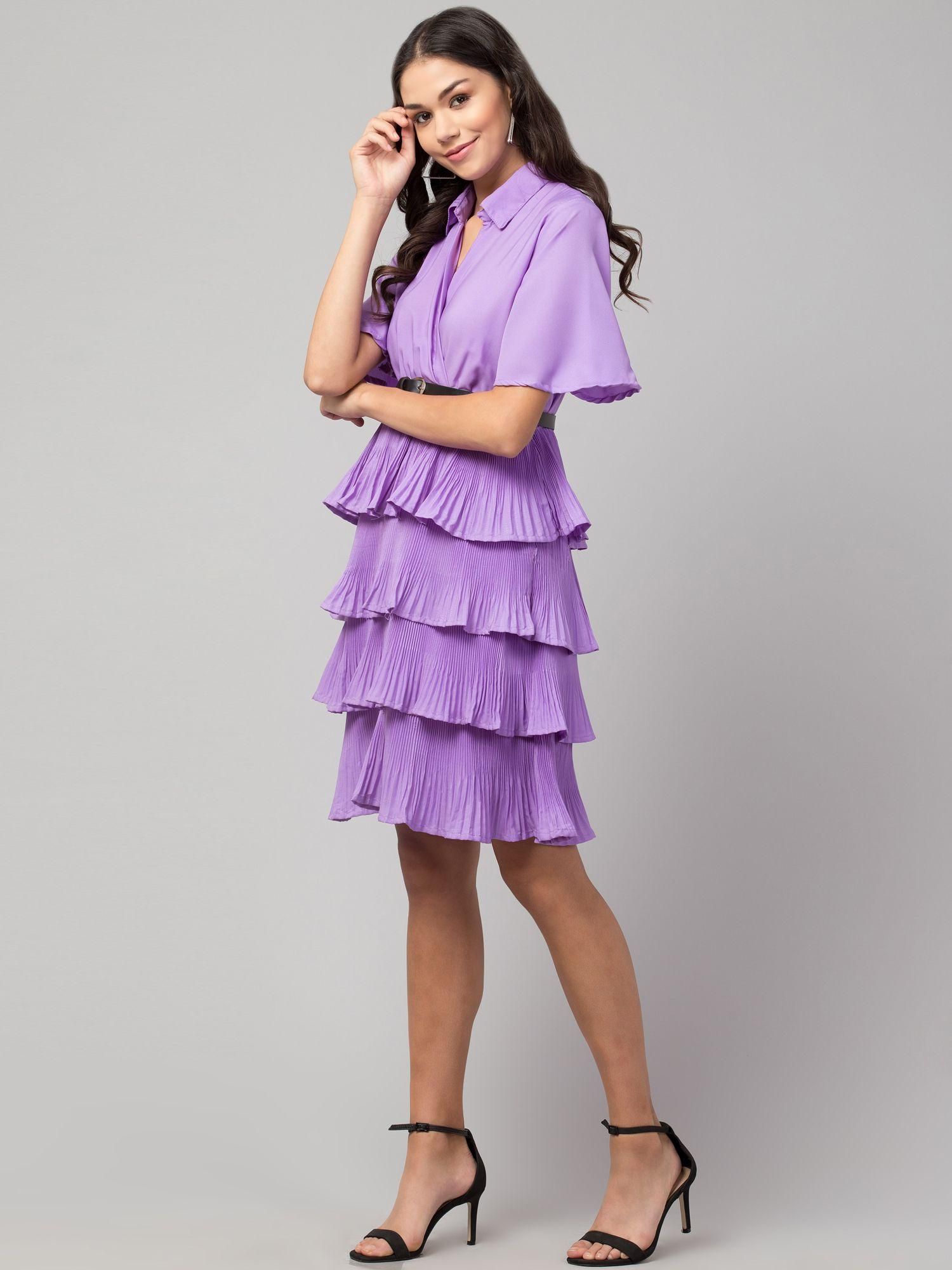 Product Name: Oceanista Women's Crepe Solid Shirt Collar Flared Lavendar Short Dress