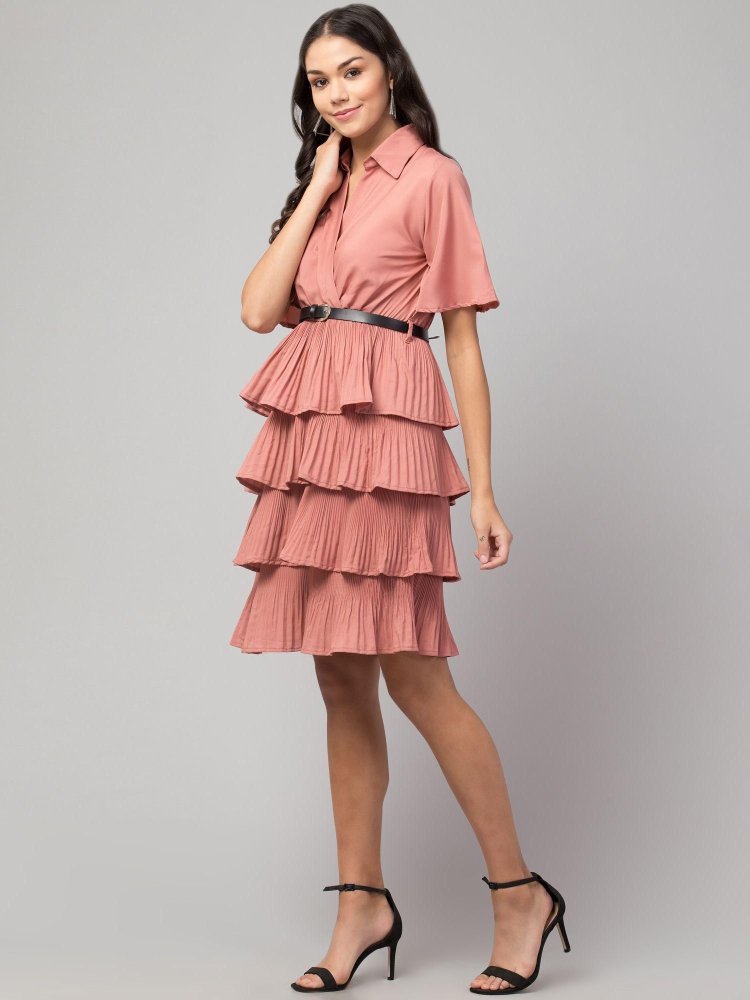 Product Name: Oceanista Women's Crepe Solid Shirt Collar Flared Peach Short Dress