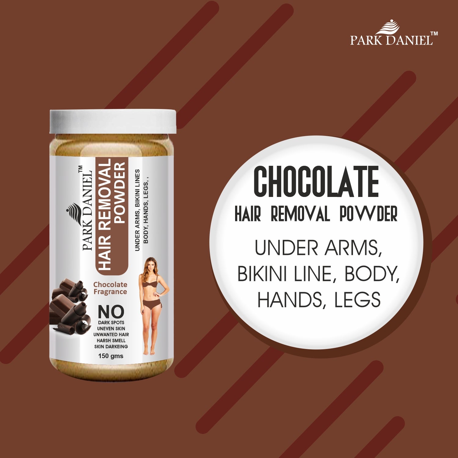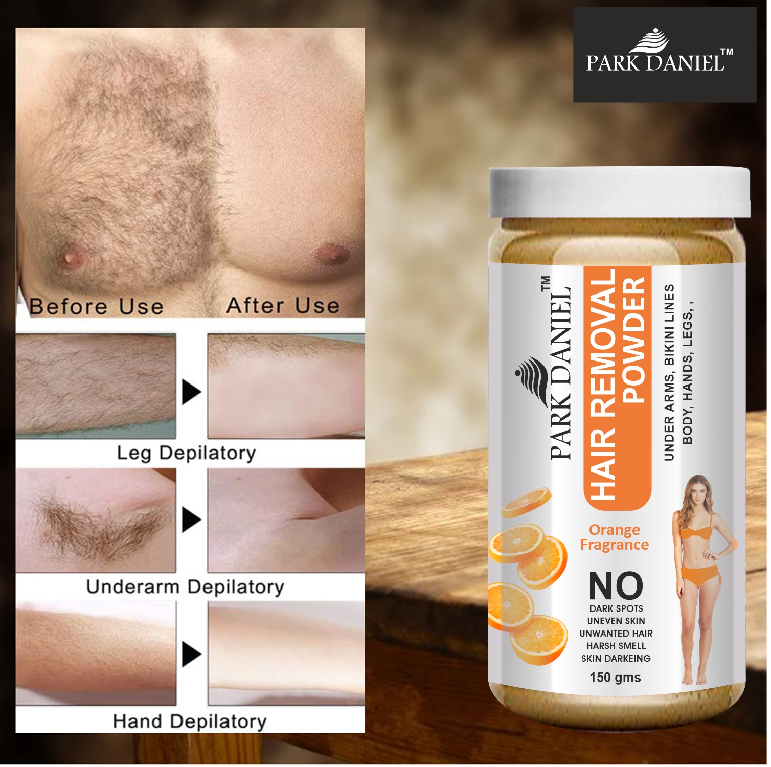 Product Name: Park Daniel Natural Orange & Chocolate Fragrance Hair Removal Powder- For Underarms, Hand, Legs & Bikini Line(Three in one Use) Combo Pack Of 2 Jars of 150gm (300gm)